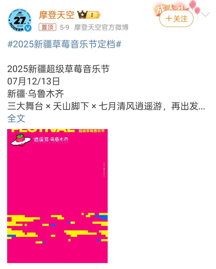 据大麦网信息,2025新疆超级草莓音乐节定于7月12日至13日在乌鲁木齐市举办。